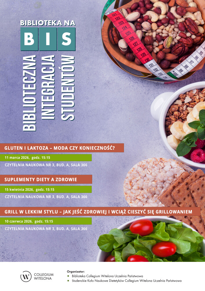 Biblioteka Collegium Witelona Uczelnia Państwowa oraz Studenckie Koło Naukowe Dietetyków Collegium Witelona Uczelnia Państwowa zapraszają na spotkania z cyklu Biblioteka Na BIS - Biblioteczna Integracja Studentów: